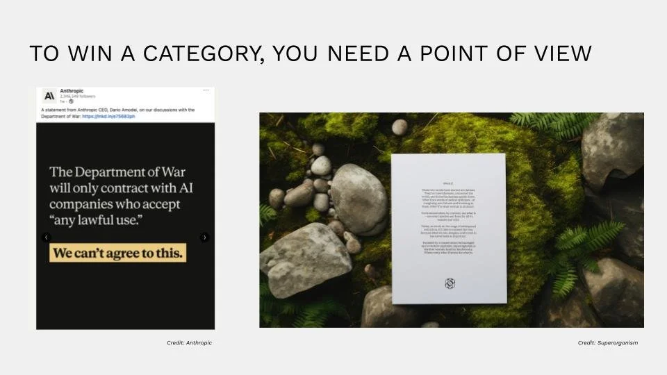 Point of view determines whether your content builds authority or fills a feed. Anthropic is a useful example. OpenAI had early distribution. Anthropic earned category credibility by stating a clear position publicly and consistently. The result was a measurable shift in adoption. Founders do not need to take every position publicly. They do need to document their thesis clearly enough that AI can reflect it.