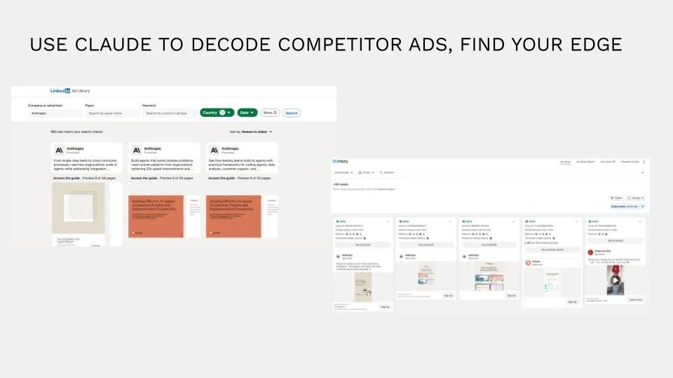 She described feeding screenshots of competitor ads, across multiple platforms, into Claude. The prompt asks Claude to identify patterns, find gaps in their positioning, and surface differentiation opportunities relative to Maison's own creative. When Claude has context about your product, your ICP, and your brand guidelines, it can make those comparisons with specificity.